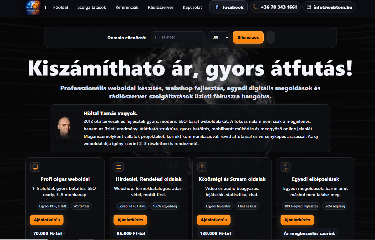 Professzionális weboldal készítés, webshop fejlesztés, egyedi digitális megoldások és rádiószerver szolgáltatások üzleti fókuszra hangolva.